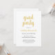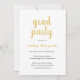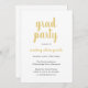 Convite simples de festa de formatura com um design clássico com "formando party" e o nome do formando com uma letra de escrita dourada grossa sobre fundo branco. Um convite elegante com um talento minimalista moderno para um formando feminino.