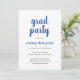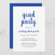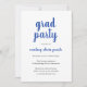 Convite simples de festa de formatura com um design clássico com "formando party" e o nome do formando com uma letra azul grossa de script sobre um fundo branco. A parte de trás é azul estável. Um convite elegante com um talento minimalista moderno para um formando feminino.