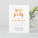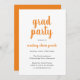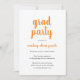 Convite simples de festa de formatura com um design clássico com "formando party" e o nome do formando com uma letra de escrita laranja grossa sobre um fundo branco. A parte de trás é laranja sólido. Um convite elegante com um talento minimalista moderno para um formando feminino.
