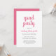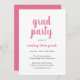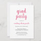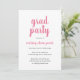 Convite simples de festa de formatura com um design clássico com "formando party" e o nome do formando com uma letra grossa de script rosa sobre um fundo branco. A parte de trás é cor-de-rosa sólido. Um convite elegante com um talento minimalista moderno para um formando feminino.