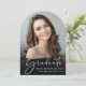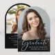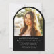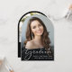 Comemore suas conquistas de formando com este elegante anúncio de graduação em forma de arco e convite de festas. "Formando" em um roteiro branco-na moda sobrepõe a foto do formando; abaixo, adicione seu nome, ano escolar e ano de aula em tipografia sorif elegante. No verso, juntar uma fotografia adicional e os detalhes da festa de formatura em letras brancas sobre fundo preto.
