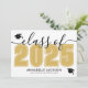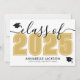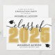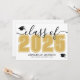 Este convite de formatura horizontal clássico e moderno duplica como um convite de festa. A frente apresenta um "Turma de 2026" superdimensionado em preto e branco em negrito, com o ano em um rico dourado amarelo, complementado por elegantes acentos em cinza em letra cursiva. Dois ícones de boina de formatura adicionam um toque comemorativo, com espaço abaixo para o nome do graduado e da escola. As cores podem ser personalizadas para combinar com as cores da escola para uma aparência personalizada.