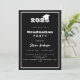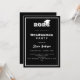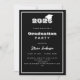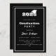 Um convite moderno e na moda para uma festa de formatura. Para ele e para ela. Fundo preto, texto branco e um quadro. Um boné de formatura branco.