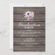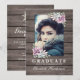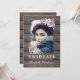 Convites de festa de formatura rústica country com fundo de celeiro de madeira rústica, uma foto do formando, uma exibição de canto suculento e um modelo de texto de formando moderno.