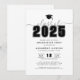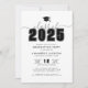 Um convite de festa de formatura elegante e moderno com "Turma de 2025" em texto grande e negrito no topo com um ícone de boina de formatura personalizável acima. Abaixo do ano, todos os detalhes do evento são exibidos de forma organizada em fontes modernas simples, incluindo o nome do graduado, data, hora e local da celebração.