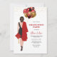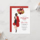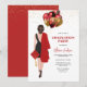 Convite à Festa de formatura de uma mulher loira. Festa de formatura Convidar retrato feminino desenhando vestido preto, boné vermelho e vestido, cabelos castanhos puxados para cima em um pão baixo. O Formando está segurando um buquê de balões vermelhos e dourados.