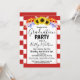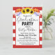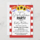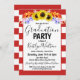 Um belo convite de festa de formatura com girassóis e listras vermelhas.