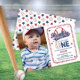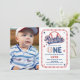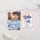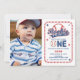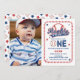 Bonita e aflitiva design de festa de aniversário do menino "Rookie of the Year". Apresenta o texto "Rookie of the Year" no tema do beisebol, com uma bola de beisebol em pé para o "O" em "One", juntamente com a costura do beisebol em torno da estrutura retangular arredondada. Frente também mostra a foto do seu filho. A parte de trás apresenta um padrão repetido de estrelas em apuros vermelhos e azuis e baseball.