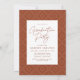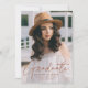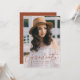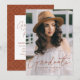Convide os convidados para celebrar a formatura com nossos convites de formatura com foto elegantes. Os convites de formatura apresentam a foto vertical do formando com "Graduate" em uma sobreposição de caligrafia moderna na cor marrom terracota. Personalize a frente do convite de formatura moderno adicionando o nome do formando, o nome da escola e o ano de formatura. O convite se inverte para exibir os detalhes da sua festa de formatura e um padrão geométrico pontilhado marrom e branco na moda.