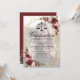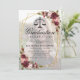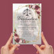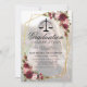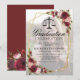 Convites elegantes para festa de graduação da faculdade de direito com foto desbotada do graduado, uma variedade de flores aquáticas em marsala vermelho, burgundy e rosa, uma forma geométrica com brilho dourado e um modelo de graduação da turma de 2025 moderno e fácil de personalizar.
