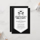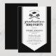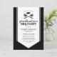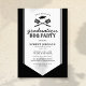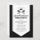 Convites de festa de graduação de verão no quintal com um fundo preto clássico, um enfeite de faixa de graduação branca no centro, um chapéu de formatura, utensílios de churrasco e um modelo de texto moderno que é fácil de personalizar. No verso há um padrão xadrez rústico.