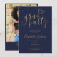 Este convite de festa de graduação chique e moderno em azul naval e dourado com a inscrição "grad party" pode ser personalizado com a foto especial do seu graduado no verso. Projetado por Thisisnotme©
