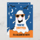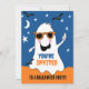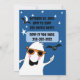 Fantasma adorável com óculos num céu azul noturno com estrelas e morcegos. Convite duplo com texto personalizado.