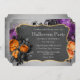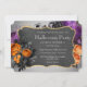 Este design de feriado apresenta rosas cor de laranja, roxo e preto e folhagem em torno de um quadro de bordo negro dourado ao longo do qual uma aranha rasteja. Suas informações personalizadas do Partido do Halloween podem ser adicionadas editando as caixas de texto fornecidas. No verso está uma textura de cinza. #halloween #feriados #sazonal #festivo #festa #halloweenparty #floral #botânico #grunge #gothic #convites #rosa ##preto #cinza #cinza #laranja #ouro #assustador #partysupply #estationery #elegante #na moda #elegante #trendendência # #popular #design #designer estilo