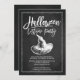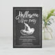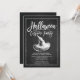 Convite de festas moderno do festival de fantasia do Halloween com um chapéu de bruxa desenhado manualmente sobre um fundo popular de quadro negro com uma letra de script com letra chic lettered hand.