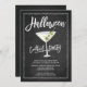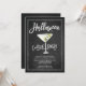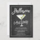 Convite de festas moderno do coquetel do Halloween com um vidro martini com um conjunto de globos oculares sobre um popular fundo preto com letra chic lettered script.