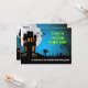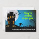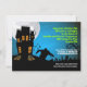 A cena é noite. A lua de cheio sobe atrás de uma casa assombrada e morcegos voam para longe. De repente, os mortos subiram do cemitério e caminharam. O inverso revela que o zumbi se aproxima com informações de eventos envolvendo a criatura. Este convite é perfeito para uma festa de Halloween ou para a próxima invasão de zumbis. Disponível com produtos correspondentes.