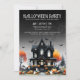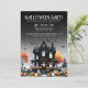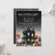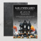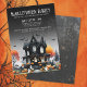 Dê boas-vindas aos convidados para uma festa de fantasias de Halloween com este convite de festa divertido e simples. Agora apresenta um fundo escuro e sombrio com fontes brancas e laranjas em negrito para um clima de Halloween vintage. O design inclui uma casa assombrada preta na parte inferior, acentuada com abóboras laranja, jack-o'-lanterns e árvores assustadoras. Fantasmas e morcegos fofos flutuam ao redor para completar o visual. A mistura de fontes ornamentadas e serifadas tem um toque ligeiramente desgastado e antigo. O verso também apresenta o mesmo fundo escuro e desgastado para um estilo sombrio coeso.