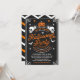 Este Cartão de Convite para Festa de Halloween inclui crânios assustadores, aranhas e um jack-o-lanterno em laranja e branco sobre fundo preto. É adequado para as festas de adultos e crianças.