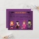 Planejar uma festa vestida de Halloween? Convide seus convidados com este convite roxo. Vem com meninos e meninas vestidos em vários adoráveis monstros e roupas de fantasia que incluem roupas de diabo com cauda pontiaguda, chifres e garfo. O vampiro com capa e colete. O pequeno vestido de bruxa rosa com vassoura e chapéu pontiagudo. O monstro de Frankenstein e um grande terno confortável. Morcegos e gatos decoram o convite.