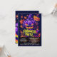 Temas púrpura e laranja brilhando abóboras Jack-O-Lanterna com folhas de outono e estrelas noturnas. Convide convidados para uma festa de fantasia de halloween com este convite impresso personalizado. Gráficos de ai generativos na moda personalizados com detalhes personalizados do seu partido. Excelente para um partido adulto, familiar ou adolescente que é apenas ligeiramente assustador.