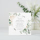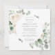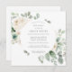 O design botânico moderno apresenta rosas brancas de marfim anestesiadas em folhas verdes de eucalipto. Os detalhes da sua festa de galinha são colocados no centro em um círculo branco. O texto da cinza da pomba complementa perfeitamente a folhagem botânica para criar uma sofisticada e chic color paleta.
