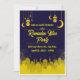 Um convite real azul escuro e amarelo para um jantar de Iftar com uma lua crescente e lanternas penduradas. O cartão é fácil de personalizar com sua redação, fonte, cor da fonte, opções de forma de papel e escolha de tipos de papel.