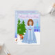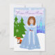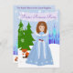 Um convite de aniversário de princesa de inverno com uma linda cena de neve de ambos os lados, uma bonito menina de cabelos castanhos e bastante espaço para detalhes de festas nas costas. Arte vetorial original pela Menagerie de Night Owl, 2014.