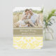 Os convites de festas de ensaio personalizados com modelos de fotografia jantam-se em amarelo-limão, amarelo-limão-claro, arenoso-árabe-esbranquiçado e branco e padrão clássico de colheita de damas florais. Personalize o texto para criar um convite único para o seu janto de ensaio de casamento. Entre em contato conosco para solicitar uma alteração de cor. Disponível em muitos produtos de casamento correspondentes.