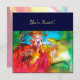 Personagem colorida, caprichosa e vibrante de máscara veneziana. Linda mulher loira sofisticada sentada com uma rosa vermelha e uma máscara de penas na mão com tecidos dourados cintilantes de fuxia de um traje de baile de máscaras barroco com penas e um cachorro. Pintura em aquarela com cores brilhantes em azul, amarelo, rosa, verde, brilho dourado e folha de prata, inspirada em personagens da Comédia da Arte (Commedia dell' Arte), Carnaval de Veneza e máscaras de penas venezianas. Este design legal e artístico é perfeito para casamentos, cerimônias nupciais, chás de noiva, festas de 16 anos, festas de aniversário de quinceanera, festas de Halloween, bailes de máscaras, bailes de dança disfarçados, compromissos românticos, anún