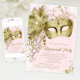 Convite de festa de máscaras cor-de-rosa e dourado com máscara de penas e jóias douradas em um belo fundo desfocado rosa e design brilhante dourado no verso. Este convite de festa de máscaras cor-de-rosa e dourado é facilmente personalizado para o seu evento, basta adicionar seus detalhes no estilo de letra, cor e texto de sua escolha. Você também pode alterar a cor do fundo.
