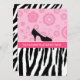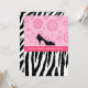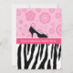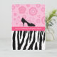 Convites de festas de moda modernos com um padrão de zebra preto e branco no fundo e flores retrorreflectoras rosadas girando no topo com um calçado giro de bolinhas alto e alto salto. Personalize para se adequar a qualquer ocasião.
