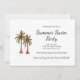 Convite de festas tropical de natação de verão, com palmeiras ilustrando design e letras pretas personalizáveis. Excelente para planejar sua festa de piscina piquenique com um tema de praia.