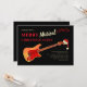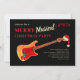 Celebre o Natal com música, alegria e risadas com este convite moderno de festa de férias com guitarra. Guitarra elétrica com chama legal vestindo um chapéu de Papai Noel com tipografia festiva e notas musicais em um fundo preto. Fácil de personalizar usando o modelo para qualquer festa de rock and roll festiva para amigos da família ou evento de escritório corporativo, especialmente se tiver música ao vivo. Arte original da artista Catherine Sweetman