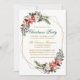 A Elegante Watercolor Poinsettia Floral Green e o Dourado Convite de festas de Natal inclui belas poinsettias vermelhas com aquarelas, verde botânico, folhagem de inverno, bagas ocas, rosas brancas, pinheiros e bagas azuis. Dourado quadro geométrico.