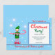 Um convite de festas de Natal para Crianças com minha trabalho de arte de um pequeno Elf segurando uma bengala doce e estrelas verdes e brancas sobre um fundo azul claro. O texto está pronto para você personalizar para suas preferências.
