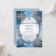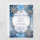 Belos flocos de neve azuis e prateados flutuam em torno de um quadro oval neste fabuloso convite de festas de festas de festas. A parte de trás é azul em forma complementar.