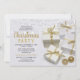 Convites de festas de Natal elegantes com fundo branco de vitrine, presentes de Natal dourado e prateado, luzes de cordas e um modelo festivo moderno que é fácil de personalizar.