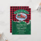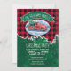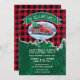 Convide seus convidados da festa de Natal em estilo com este convite de cartão plano temático. O design apresenta um caminhão de coleta de vintage vermelho em uma cena de neve com gelo. Acima está uma faixa verde com seu nome de família e abaixo dos detalhes de sua festa para você personalizar. O fundo da design tem xadrez de búfalo vermelha e preta e pinheiros. Concebido pelo artista mundialmente famoso ©Tim Coffey.