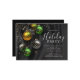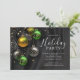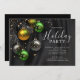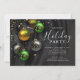 Festa de Natal moderna com um fundo preto com ornamentos de bola de Natal verdes e dourados.