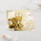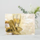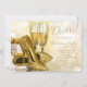 Convite para a festa de Natal corporativa de Ano Novo com elegantes taças de champanhe douradas, sapatos de salto alto com glitter dourado e presentes embrulhados com fita dourada em um belo fundo bokeh dourado. Este convite elegante de Natal corporativo dourado é facilmente personalizado para o seu evento, basta adicionar seus detalhes no estilo de fonte e cor de sua escolha.