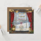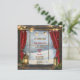 Uma cena de inverno como se vê olhando pela janela da vintagem com um convite para uma festa de Natal da família Aproveite o silêncio deste convite com nevando fora, cortinas vermelhas e lanternas iluminadas com luzes suavemente brilhantes