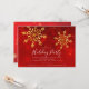 Festa moderna de elegância com fundo vermelho com flocos de neve dourados.