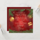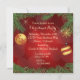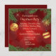 Este é um convite elegante para uma festa de feriado, com as informações da sua festa em dourado no centro. A parte superior e inferior têm uma borda de agulhas de pinheiro verdes e pinhas. Algumas estrelas douradas brilham ao fundo, e dois enfeites de árvore decorados em vermelho e dourado pendem nas laterais. As imagens e o texto são colocados em um fundo vermelho gradiente com um padrão de círculo sutil. O verso do convite é vermelho sólido correspondente. É fácil adaptar este convite para uma empresa ou negócio. Se você quiser adicionar texto adicional ao verso, escolha Personalizar. *Obrigado ao Scrap and Tubes pelos clipart usados neste design.
