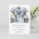 Uma casa festiva de aquarela define a cena para sua reunião de férias. Esta design de Natal nevada apresenta uma porta azul, terras arborizadas e cinco coroas — perfeito para festas aconchegantes, casas abertas de inverno ou celebrações sazonais. Disponível como convite impresso, download digital ou ambos.