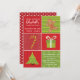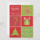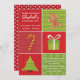 Um convite bonito, perfeito para uma festa de férias de uma criança com um fundo de diferentes padrões festivos em verde e vermelho, com ilustrações de um homem de gengibre, uma cana doce, um presente embrulhado em papel de embalagem de férias e uma árvore de Natal. O fundo padrões faixas verdes, bolinhas vermelhas e brancas, faixas vermelhas, flocos de neve e uma cor damasco vermelha sutil. Personalize o texto para criar seu próprio Convite de festas de Natal divertido para seus filhos.