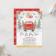 Movimento festivo por chá de fraldas com balões vibrantes vermelhos e dourados, pinheiros aquíferos, paisagem florestal de neve e carro vintage chic