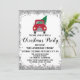 Celebre a época de férias com este caminhão festivo vermelho-vintage com presentes de Natal. Os detalhes do partido são escritos em uma tipografia branca e esbranquiçada de escrita negra, com uma luz cintilante prateada brilha na borda e fundo branco. Este convite é perfeito para uma festa de Natal/ Natal/ inverno!