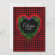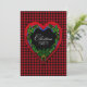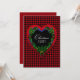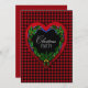 Um convite de festas de Natal na moda preto e xadrez vermelha de búfalo, com um vibrante coração botânico vermelho e verde.