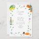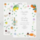 Convite de casamento ou noivado moderno, colorido e temático de queijo e vinho, com aquarela francesa boêmica e caprichosa, com simples elementos botânicos e tema de cítricos laranja e limão, ideal para um casamento ensolarado de verão ou festa de noivado com tema europeu. A obra de arte original da artista Catherine Sweetman inclui folhagens, flores silvestres, queijo e vinho franceses, a bandeira francesa, notas musicais e taças de vinho borbulhante. Caligrafia caprichosa e tipografia moderna com modelos fáceis de personalizar para adicionar nomes, data e outras informações essenciais, juntamente com as iniciais dos noivos na etiqueta da ilustração da garrafa de vinho espumante. A paleta de cores inclui limão, amarelo, laranja, verde, azul, roxo e rosa.